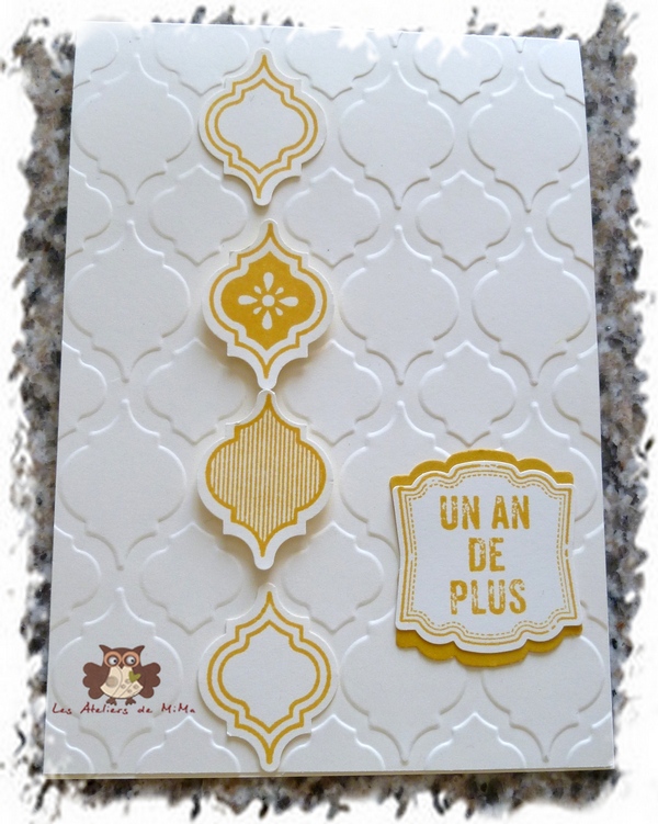 Quelques tamponnages avec le set “Mosaic Madness” (page 123) et de l’encre “Cari moulu”, puis un passage à la perforatrice Mosaïque (page 180).