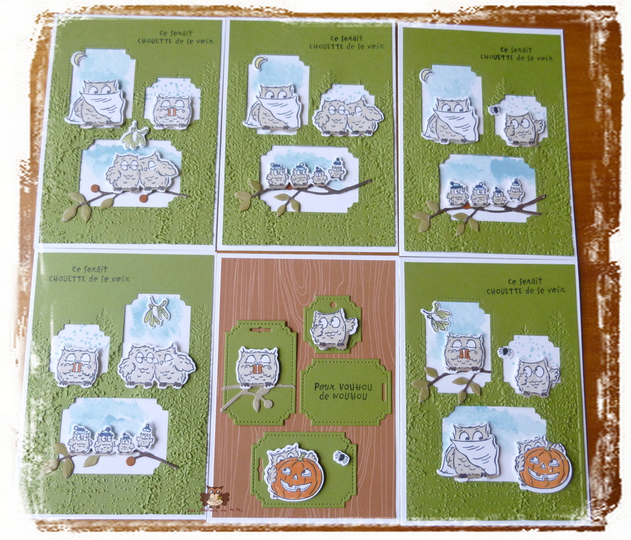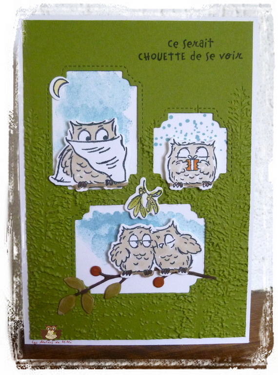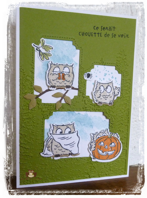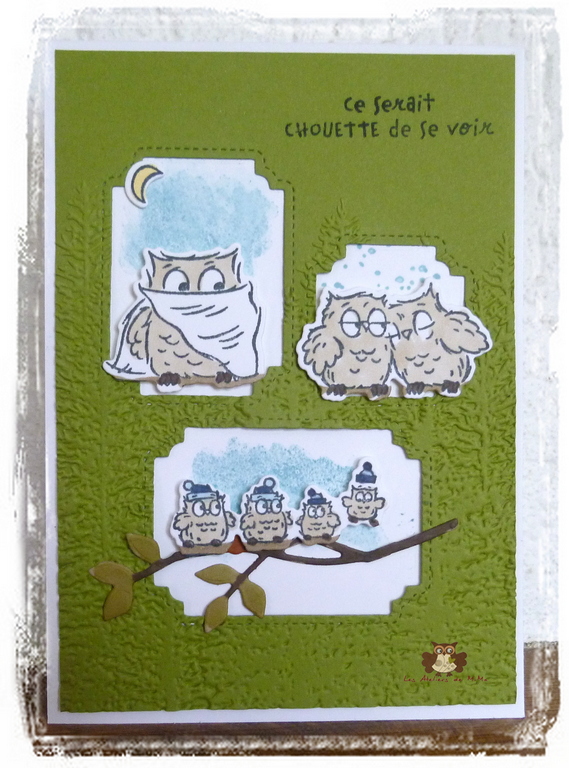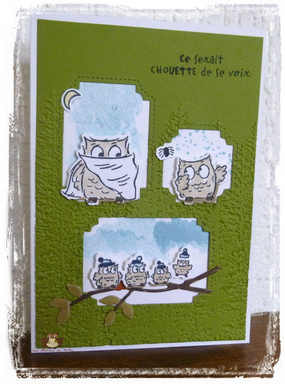 J’ai passé le papier vert à la big shot, avec le plioir à gaufrage Forêt de conifères. Sur le papier blanc, j’ai tamponné un peu de bleu et collé les chouettes.