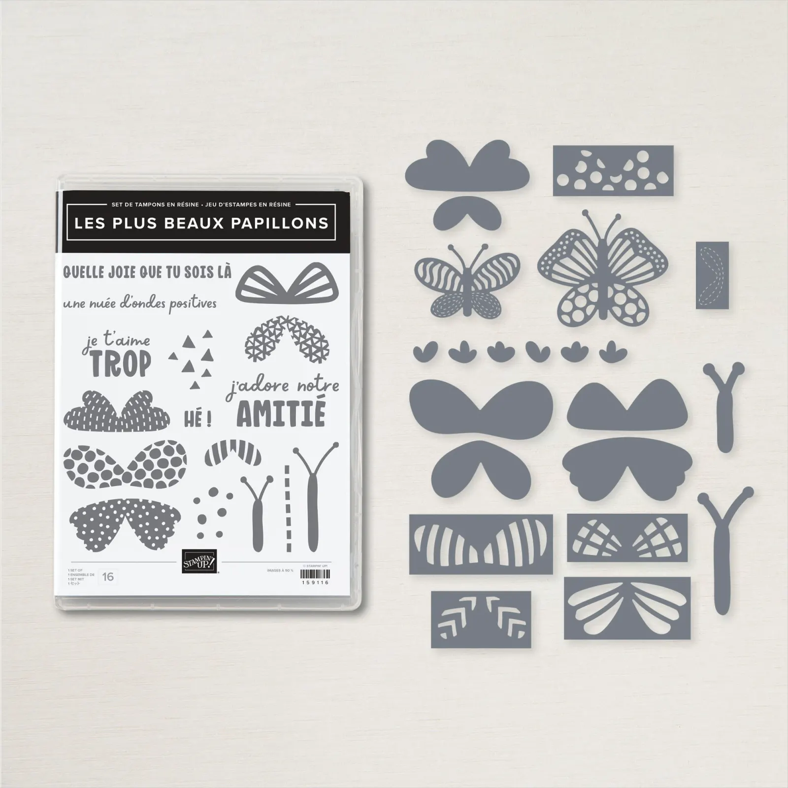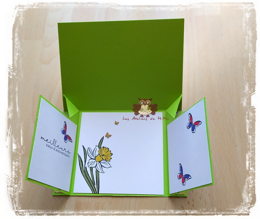 J’ai utilisé les papiers “Bisous de papillon” Réf. 159112 – 14,75€ et les tampons et les poinçons assortis “Les plus beaux papillons” Réf. 159121 – 58,50 € le lot. J’ai ajouté une jonquille issue du set de tampons “Daffodil daydream” Réf. 157786 – 28€