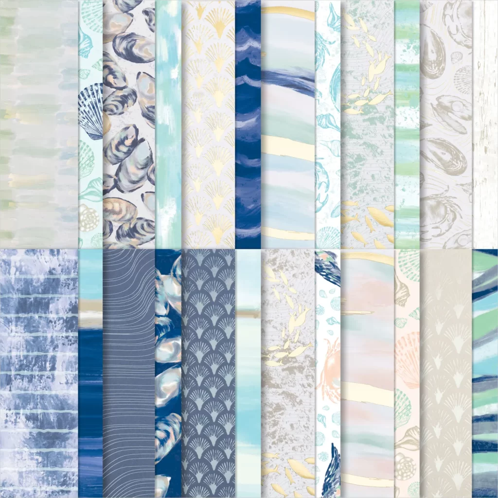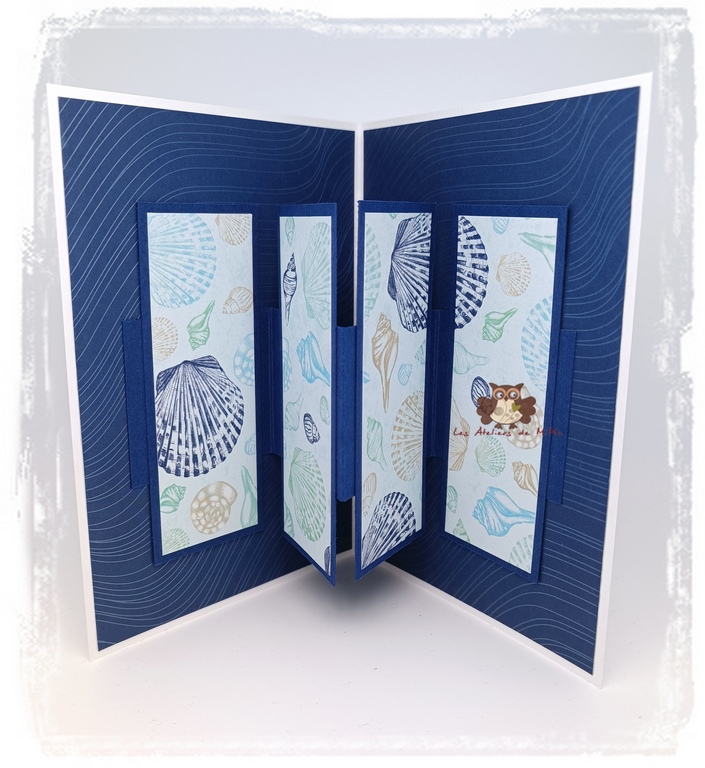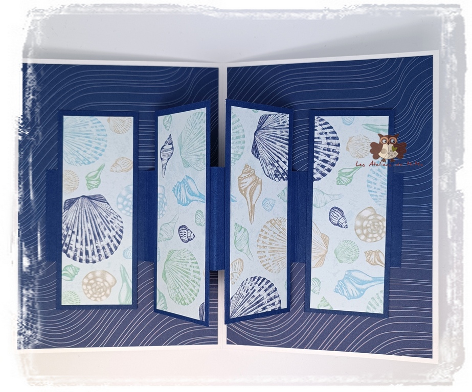 Le résultat m’a beaucoup plu, j’ai recommencé avec le papier “Sur la baie”, et j’ai changé les dimensions des bandes intérieures, pour mettre en valeur l’imprimé intérieur, et voici le résultat.